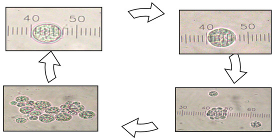 Meanwhile, Figure 2 shows the morphology of the algal strain (×40 magnification). It was found that the cell culture was increased from a single colony (lag phase) into clustered colonies (log phase).