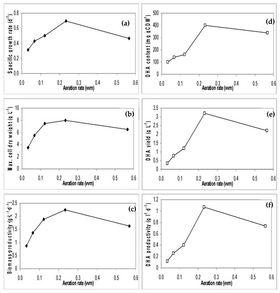 The maximum biomass of 8 g/L, corresponding to the highest DHA yield of approximately 3.2 mg/L, was obtained at an aeration rate of 0.25 vvm. The increased biomass concentrations at higher aeration rates were also observed by other workers [3,18]. In addition, Chi et al., 2009 [3] illustrated that high oxygen levels were favourable to cell reproduction. High aeration rates intensified cell respiration and energy metabolism, which could trigger more carbon flux flow to the tricarboxylic acid cycle. The decline in algal cell growth at aeration above the optimum rate could be possibly caused by either nutrient limitation or inhibition. Therefore, appropriate aeration adjustment should be adopted to promote the efficiency of substrate utilisation efficiency in pilot-scale production.