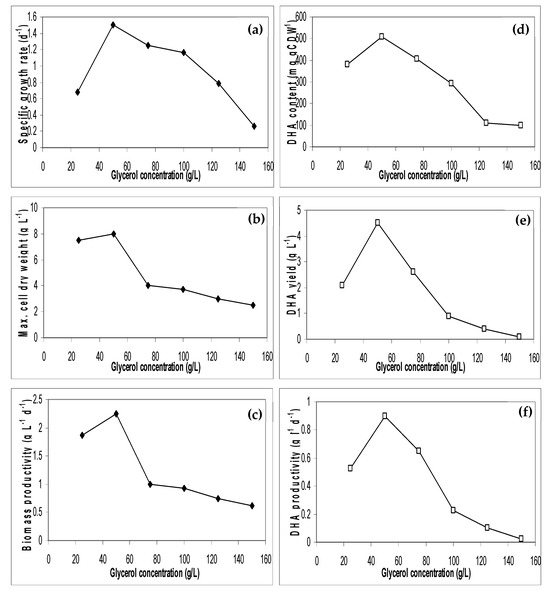Influence of glycerol concentrations on cell growth performance (a–c) and DHA production (d–f) using S. limacinum (Triplication).