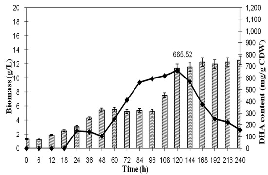 Figure 7 shows the kinetic between algal biomass and DHA production during aerobic batch fermentation. It was revealed that the maximum biomass was obtained at 11.40 g at 120 h while the maximum DHA in algal biomass was achieved at 665.52 mg/g, which was equivalent to 6.27 g of the DHA yield/g BDWG.