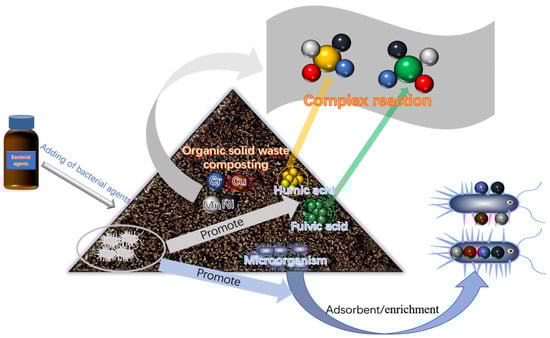 Some passivators can regulate the transformation of carbon, nitrogen, and phosphorus and accelerate the decomposition of OM, improve the microbial community structure, and reduce the toxicity of heavy metals through direct microbial adsorption or enrichment/metabolism mechanisms [48]. In addition, microorganisms can regulate OM degradation and HS formation through the replication and expression of cellulase and ligninase genes and reduce the bioavailability of heavy metals through complexation [58]. This principle is discussed in Section 4.3. Zhang et al. [41] suggested that activated carbon affects the passivation efficiency of heavy metals by influencing environmental factors and changes in the bacterial community structure during the composting process. Moreover, there is a correlation between the various forms of different heavy metals and different species of microorganisms during the composting process. Cao et al. [59] evaluated the toxicity of heavy metals in the industrial-scale aerobic composting of livestock manure with Bacillus strains and found that the addition of the bacteria accelerated the degradation of OM in the compost to form FA and HA that were more readily bound to metal ions to form organically bound heavy metals, thereby reducing their biological effectiveness (Figure 2). The addition of Bacillus strains contributed to the passivation of heavy metals. Guo et al. [60] used structural equation modeling (SEM) to investigate the passivation pathways of heavy metals in compost with different C/N and different additives, revealing the complex passivation mechanisms of different heavy metals during the composting process. Hu et al. [46] studied the dynamics of bacterial communities and heavy metal composition during the composting of PM and maize straw and found that different bacteria played different roles for specific heavy metals, e.g., Bacteroidetes played a key role in the passivation of Zn, Cu, and Cr; Bacillus in Deinococcus-Thermus was involved in the translocation of Zn and Pb; and Bacillus deformans played a major role in the morphological transformation of the Cd fraction.