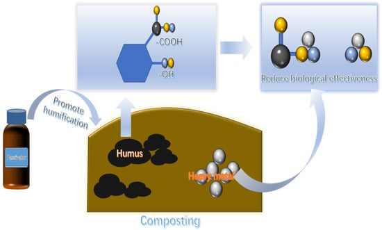 The HS content of compost is closely related to the presence of heavy metals. HS and HA are generally considered to contain a large number of surface functional groups such as carboxyl groups, phenolic hydroxyl groups, alcohol hydroxyl groups, amides, and aldehydes that combine with heavy metals to form binary or multiple complexes to reduce their mobility [61] (Figure 3). This passivation mechanism has been addressed using physical, chemical, and biological passivators, but the detailed mechanisms of HS migration and heavy metal transformation in compost are relatively poorly understood. Kong et al. [50] concluded that the passivation rate of heavy metals was significantly and positively correlated with HS, HA content, and the HA/anthranilic acid ratio and that the addition of passivating agents to compost increased the passivation rate of heavy metals by promoting the humification process. The results showed that the higher the maturity and degree of humification of the compost, the more effective the passivation of heavy metals. Song et al. [11], in their study of biochar/montmorillonite-amended compost, found that organic components such as HS, HA, and FA, as well as dissolved organic carbon (DOC), were inextricably linked to morphological changes in Cu and Zn and that the use and conversion of low humic organic fractions in combination with enhanced humic components to promote potential heavy metal resistance/acting bacteria were the best way to improve heavy metal passivation rates. Liu et al. [42] investigated the effects of three combinations—phosphogypsum and calcium oxide (PPG + CaO), calcium superphosphate and calcium oxide (SSP + CaO), and zeolite—on compost maturity and heavy metal passivation in PM composting. The bioavailability of Cu, Cd, Pb, and Cr during composting could be reduced by 49.2%, 5.0%, 26.6%, and 54.3%, respectively, and the reductions were positively correlated with HA content and HA/FA.