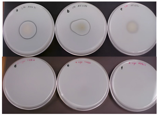 Growth of Aspergillus sp. strains on skimmed milk plates: (a) A. niger ANH-15, (b) A. niger 2088, (c) A. oryzae 2095, (d) A. niger DAR2, (e) A. niger C28B35, (f) A. niger AD96-4.