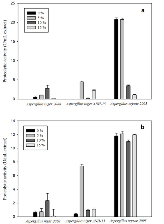 The results of the effect of glucose at different concentrations in protease production showed that A. oryzae 2095 produced the highest proteolytic activity at 36 h culture (Figure 2a) with added glucose concentrations of 0 and 5% (20.0–20.5 U/mL respectively). However, enzyme activity decreased at 72 h (Figure 2b), showing a similar pattern at all glucose concentrations tested. Activity decrease is explained as the result of protease self-hydrolysis, instability of the protease’s activity, or a decrease or even lack of nutrients in the culture medium [37. A similar pattern is observed in all the strains studied, however, A. oryzae 2095 produces 4 and 17 times higher proteolytic activity than A. niger ANH15 and A. niger 2088, respectively, at 5% glucose and 36 h fermentation.