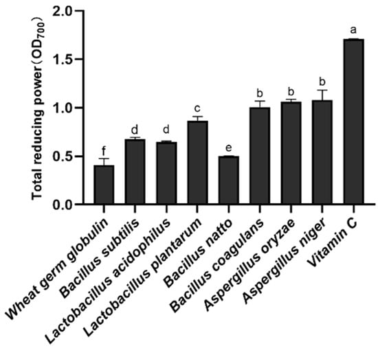Reducing power of fermented wheat germ protein supernatants of different strains (Different corresponding letters indicate significant differences at p < 0.05 by Duncan’s test).