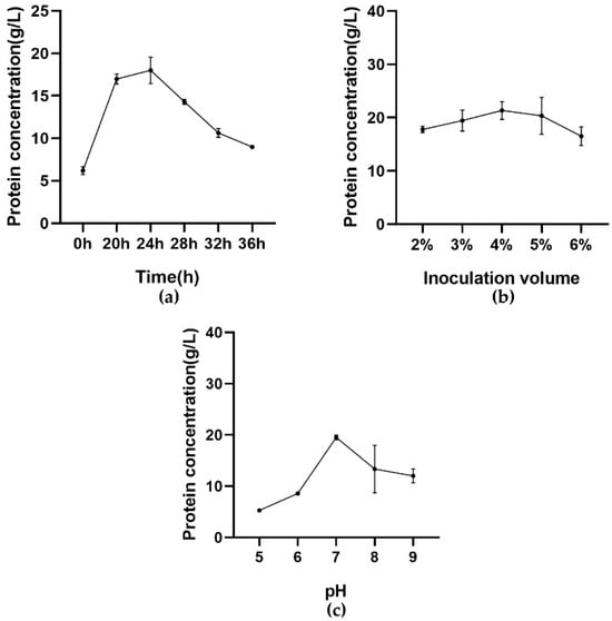 Effect of fermentation time (a), inoculum volume (b), and pH (c) on protein concentration.