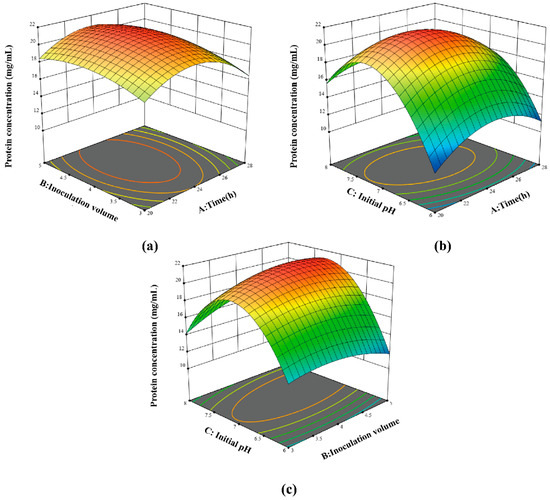 Effect of fermentation time and inoculum volume (a), initial pH and fermentation time (b), initial pH and inoculum volume (c) on protein concentration.