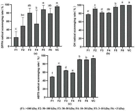Analysis of antioxidant effects of peptides with different molecular weights: (a) DPPH free radical scavenging capacity; (b) OH free radical scavenging capacity; (c) ABTS free radical scavenging capacity (Different corresponding letters indicate significant differences at p < 0.05 by Duncan’s test).