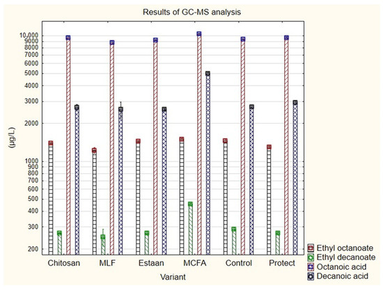 Figure 1 shows the concentrations of fatty acid esters and fatty acids (Figure 1). The most statistically significant differences were observed in the concentrations of ethyl decanoate and decanoic acid, which peaked in the MCFA and control variant, while the control variant exhibited the lowest values. Lipases, released from lactic acid bacteria, metabolise lipids, thereby elevating the concentration of volatile fatty acids in wine [56]. Some studies have reported an increase in octanoic acid after malolactic fermentation [57,58,59]. However, our study did not confirm this, as the control variant undergoing malolactic fermentation displayed the lowest concentration of these fatty acids. Other studies also support this, indicating that malolactic fermentation might reduce octanoic acid in wine [59,60,61].