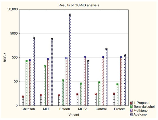 Figure 2 displays the concentrations of 1-propanol, benzyl alcohol, methionol and acetoin. The variant using fumaric acid (15.9 µg·L−1) contained the highest concentration of 1-propanol, while the chitosan variant contained the least (11.8 µg·L−1). Significant differences were noted in the concentration of benzyl alcohol, with the highest concentration in the chitosan variant (363 µg·L−1) and the control (249 µg·L−1), and the lowest concentrations in the Estaan, MCFA, control and fumaric acid variants (38.5–56 µg·L−1). Differences in the concentration of volatile substances can be caused by the different activity of b-glucosidases that were released from yeast or lactic acid bacteria. An increased content of benzyl alcohol was noted in samples that undergo MLF, which can increase the content of this compound [65].