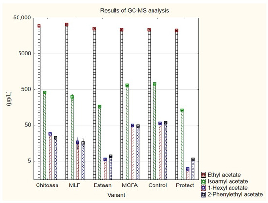 Figure 3 presents the concentrations of ethyl acetate, isoamyl acetate, 1-hexyl acetate and phenylethyl acetate. The MLF (33,896 µg·L−1) and chitosan (28,974 µg·L−1) variants contained the highest concentration of ethyl acetate, while the fumaric acid (22,506 µg·L−1) and MCFA (23,012 µg·L−1) variants showed the lowest concentrations, all exceeding the odour threshold [59] (12,300 µg·L−1). Studies have reported that ethyl acetate exhibits pineapple, fruity, solvent and balsamic scents [70]. Changes in ethyl acetate content can be caused by MLF, depending on the species or strain of lactic bacteria [65].