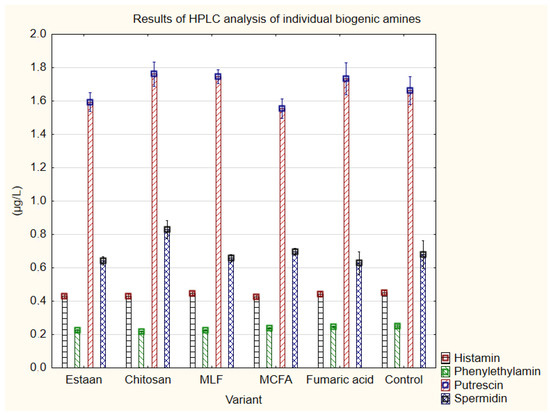Regarding the effect on the content of biogenic amines, only a very slight, statistically insignificant impact of individual preparations was observed (Figure 5). The preparations had no discernible effect on the histamine content, as the concentration in all samples ranged from 0.43 to 0.45 µg·L−1. The only slight difference was noted in the concentration of putrescine and spermidine, with their highest concentration measured in the chitosan variant (1.76 µg·L−1 for putrescine and 0.83 µg·L−1 for spermidine). This concentration was higher than that in the MLF variant, where malolactic fermentation took place, and the lowest in MCFA (1.56 µg·L−1 for putrescine) and fumaric acid (0.63 µg·L−1 for spermidine). Since the formation of biogenic amines is mainly caused by lactic bacteria, these differences may result from different mechanisms of action of individual oenological preparations on the microflora of the investigated wines [75].