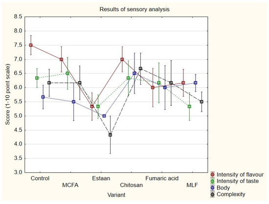 Figure 6 displays the results of individual sensory characteristics, such as flavour intensity, taste, body and complexity. The Estaan variant exhibited the lowest score in all sensory characteristics. Flavour intensity was higher in the control, MCFA and chitosan variants, while it was lowest in Estaan, fumaric acid and the MLF variant. Taste intensity showed no statistically significant differences, except for the Estaan and control variants. The results for body and complexity did not show statistically significant differences between individual variants.