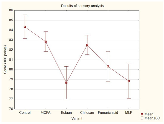 Figure 7 illustrates the results on a 100-point scale of sensory analysis. The best results were obtained in the control, MCFA and chitosan variants. These results corresponded to the results of the aromatic profile measured by gas chromatography, where the control and MCFA variants exhibited the highest concentrations of positive volatile compounds such as esters.