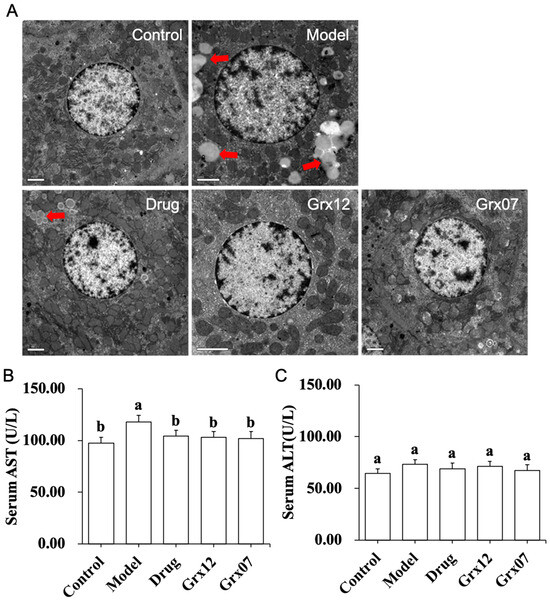 Compared with the Control group, the serum AST level in the Model group was significantly increased (p < 0.05). After treatment with drugs and probiotics Grx12 and Grx07, the serum AST levels in the Drug, Grx12 and Grx07 groups were significantly reduced (p < 0.05) (Figure 1B). There was no significant change in the serum ALT between groups (p > 0.05) (Figure 1C).
