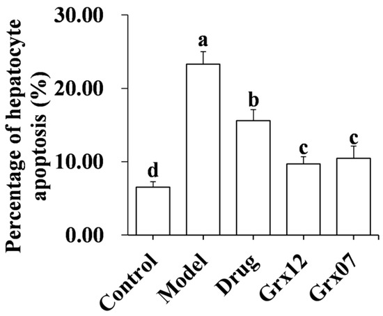 Effect of human-derived probiotics on the hepatocyte apoptosis of rats. Different letters indicate significant differences (p < 0.05).