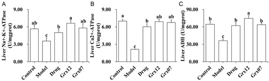 The ADH, Na+-K+-ATPase and Ca2+-ATPase activities in the rats’ livers the Model group were significantly reduced (p < 0.05) compared with the Control group. The treatments with drug and probiotics significantly increased the levels of ADH, Na+-K+-ATPase and Ca2+-ATPase in the rats’ livers (p < 0.05). The effect of Grx12 was significantly better than that of the drugs and Grx07 (p < 0.05) (Figure 3).