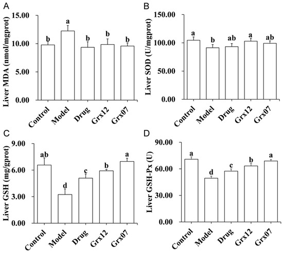 Long-term intake of large amounts of alcohol resulted in a significant reduction in the levels of SOD, GSH and GSH-Px, which exert antioxidant functions in the rat liver (p < 0.05) (Figure 4B–D). Correspondingly, the level of lipid peroxidation product, MDA, was increased significantly in the livers of the rats in the Model group (p < 0.05) (Figure 4A). The treatments with drugs and probiotics could significantly increase the levels of SOD, GSH and GSH-Px, and reduce the level of MDA (Figure 4). The effect of Grx07 on the levels of GSH and GSH-Px was significantly better than that of the drugs or Grx12 (p < 0.05) (Figure 4C,D).