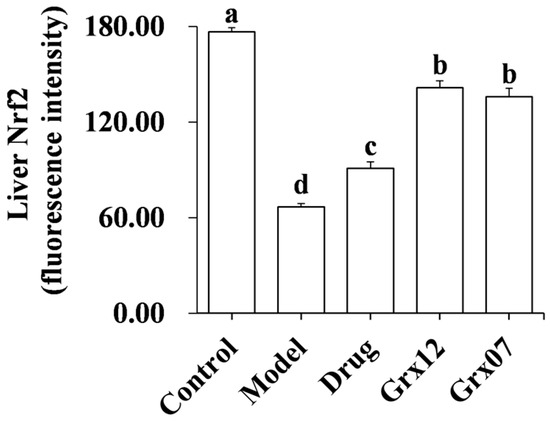 The protein expression of Nrf2 in the rat liver of the group Model was significantly lower than that of the group Control. After treatment with the drug and probiotics, the protein expression of Nrf2 in rat liver of the group Drug, Grx12 and Grx07 were significantly increased (p < 0.05). The effects of probiotics were significantly better than drugs (p < 0.05) (Figure 5).