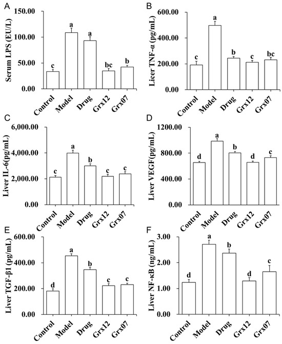 The levels of TNF-α, IL-6, VEGF, TGF-β1 and NF-κB in the livers of rats in the Model group were significantly higher than those in the Control group (p < 0.05). After the treatments with drugs and probiotics, these inflammatory factors were significantly reduced (p < 0.05) (Figure 6B–F). The effects of the probiotics were significantly better than those of the drugs (p < 0.05) (Figure 6). The effect of Grx12 on the levels of VEGF and NF-κB was significantly better than that of Grx07 (p < 0.05) (Figure 6D,F).