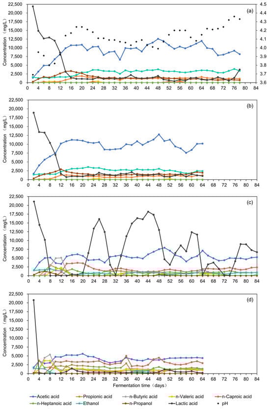 Variation of fermentation products during the experiment; (a) R0; (b) R1; (c) R2; and (d) R3.