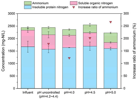 Figure 2 presents a summary of the nitrogen distribution in the influent and the effluent of the fermenters. In the influent, approximately 70% of nitrogen existed in solid organic matter, and the majority (>99% by mass) of insoluble organic nitrogen was undissolved protein nitrogen (1570–1700 mg/L). The soluble organic nitrogen was 622.4 ± 85.5 mg/L, and the ammonium concentration was only 104.3 ± 36.9 mg/L. After fermentation, the average concentration of insoluble organic nitrogen showed insignificant differences (p > 0.1) in these reactors compared to the influent. The quantities of bacteria in R0, R1, R2, and R3 were approximately 4.44 × 108 copies/mL, 1.55 × 108 copies/mL, 6.28 × 108 copies/mL, and 9.68 × 108 copies/mL, respectively (Figure S1). It was assumed that the bacteria in the fermentation broth had the same weight as Escherichia coli at 2.8 × 10−13 g per cell, and the water content of the cells was 75% [22]. The nitrogen content of the dry cells was 13%, according to the composition measurement of mixed anaerobic culture [23]. The cell nitrogen was finally calculated as 4.04 mg/L, 1.42 mg/L, 5.71 mg/L, and 8.81 mg/L, respectively. Although the higher pH relieved the inhibition and promoted the proliferation of microorganisms [24], the assimilation of nitrogen was minimal, with less than 10 mg/L of cell nitrogen, due to the limited energy obtained from anaerobic reactions. The solubilization of solid proteins was also limited in the fermentation process at pH 4.0–5.0. However, a portion of soluble organic nitrogen was utilized by microorganisms and converted into ammonium. The concentration of ammonium showed a positive correlation with pH conditions. At pH 4.0, uncontrolled pH (pH 4.2–4.4), pH 4.5, and pH 5.0, the ammonium concentration increased by 122%, 180%, 202%, and 267%, respectively, compared to the initial concentration in the influent. This result suggests that more active microorganisms utilized soluble organic nitrogen and released ammonium at higher pH levels.