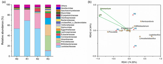 Taxonomic annotation was performed based on metagenomic data. A total of 153 phyla, 280 classes, 606 orders, and 1311 families were identified in the four reactors. Firmicutes emerged as the dominant phylum in R0, R1, and R2, accounting for 57%, 72%, and 63% of the total abundance, respectively, followed by Actinobacteria (40% in R0, 23% in R1, and 34% in R2). In contrast, Actinobacteria (37%) was the predominant phylum in R3, followed by Bacteroidota (33%) and Firmicutes (27%). The composition of the microbial communities at the family level is illustrated in Figure 3a.