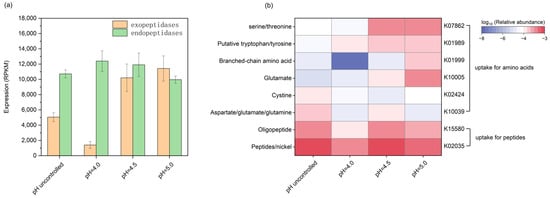 Microorganisms can secrete enzymes to break proteins into peptides and amino acids, which are then taken up by the membrane transport system and ultimately participate in metabolism [26]. Enzymes with proteolytic abilities are peptidases [29]. In the KEGG database, peptidases are further categorized into endopeptidases and exopeptidases. Endopeptidases (EC 3.4.21–3.4.99) cleave peptide bonds within the polypeptide chain at specific sites, while exopeptidases (EC 3.4.11–3.4.19) catalyze the cleavage of amino acids from either the N-terminus or C-terminus of the polypeptide substrate, resulting in the production of free amino acids and oligopeptides [30]. The expression of the two peptidases in different reactors is depicted in Figure 4a. The four reactors showed similar transcriptomic activities regarding endopeptidases, but the expression of exopeptidases exhibited a positive correlation with pH values. At uncontrolled pH, pH 4.5, and pH 5.0, the expression levels were approximately 3.6, 7.3, and 8.2 times higher than at pH 4.0. The results indicated that the reactors had similar abilities to break down protein chains at internal sites. In contrast, at higher pH levels, microbes tended to secrete more exopeptidases, increasing the formation of amino acids, dipeptides, etc.