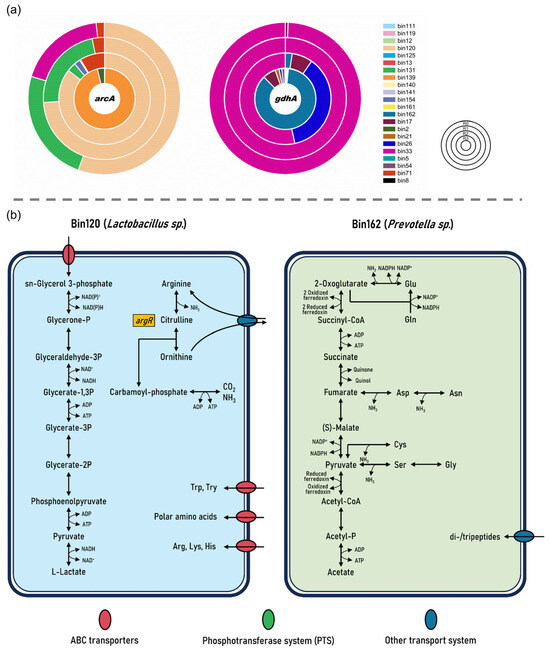 (a) The relative contribution of MAGs to transcripts of key genes related to ammonium release (gene arcA (arginine deiminase, EC 3.5.3.6); gene gdhA (glutamate dehydrogenase, EC 1.4.1.4); (b) pProposed metabolic pathways of Bin120 and Bin162.