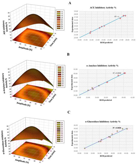Response surface plots (3D) and linear for ACE inhibitory activity (A), α-amylase inhibitory activity (B), and α-glucosidase inhibitory activity (C) analysis as a function of significant interaction factors for RSM.