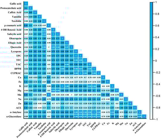 Pearson correlation relationship between samples’ antioxidant activity, phenolic compounds, bioactive compounds, mineral, antidiabetic and antihypertensive values.