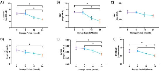 Anthocyanins are flavonoids commonly found in fruits that exert strong antioxidant activity. Bioactive compounds such as anthocyanin and TPC enhance food quality, such as color and taste, and play an essential role in human wellness []. Anthocyanins are provided in purple, blue, or red colors for fruit []. The results revealed that the TAC content was significantly (p < 0.05) decreased to 3.45 mg/100 mL compared to 4.29 mg/100 mL after 24 months of storage. Similar to the present study, Choi et al. (2002) reported that total anthocyanin in reconstituted blood orange (Citrus sinensis) juice decreased (25%) after 7 weeks at 4.5 °C [].