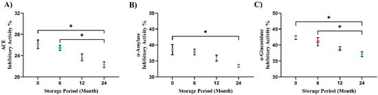 The antidiabetic and antihypertensive effects are shown in Figure 4. Storage for 24 months significantly (p < 0.05) decreased the level of α-Amylase inhibitory activity by about 13.09% when compared to 0-month storage. Wen et al. (2023) indicated that pickled tea (30 mg/mL) inhibited 50.1 ± 2.0% of α-amylase enzymatic activity, and the inhibitory rate increased after 2 months of fermentation but decreased after 8 months []. Yim et al. (2015) found that the α-glucosidase inhibitory ability of Cudrania tricuspidata (Kujippong) vinegar was shown to be 91.4% after 72 h of fermentation []. Positive correlations among α-Amylase inhibitory activity and bioactive compounds were found in some cases; e.g., DPPH (1), TPC (0.98), lycopene (0.98), TAC (0.96), and TFC (0.95).