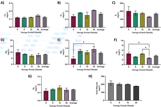 Cu (A), Fe (B), K (C), Mg (D), Mn (E), Na (F), Zn (G), and total mineral (H) of the ultrasound-treated watermelon traditional vinegar sample. Letters atop bars indicate statistically significant differences (ns: no significant; * p < 0.05; (n = 3 ± SD).