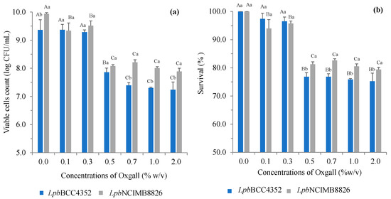 The effects of bile salts concentrations on growth of L. plantarum strains. The strains were exposed to the tested bile at 37 °C for 4 h. (a) the viable cell counts after bile salt exposure for 4 h and (b) the % survivability after bile salt treatments are shown. Data represent the means of triplicates. Significant differences were analyzed by one-way ANOVA with Duncan’s multiple range test. Uppercase letters represent significant differences among the oxgall concentrations of the same strain (p ≤ 0.05). Lowercase letters represent significant differences between the strains at the same oxgall concentration (p ≤ 0.05).