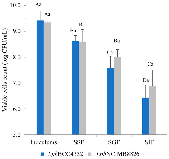 The survivability of LpbBCC4352 cells in a simulated human digestive model is illustrated in Figure 3. When exposed to SSF containing amylase, LpbBCC4352 demonstrated a viability exceeding 90%, with a retained cell count of 8.6 log CFU/mL. However, sequential exposure to SGF for 2 h resulted in a further slight reduction in the survival count by 1.0 log cycles, with the count retaining 7.6 log CFU/mL. After an additional 4 h of exposure to SIF, viability decreased further by an average of 1.2 log cycles, and the final cell count reached 6.4 log CFU/mL. Similar results were obtained when LpbNCIMB8826 was subjected to the tested model; a decline in cell count was observed when the strain was sequentially exposed to SIF. The cell viability is retained at 6.9 log CFU/mL at this stage. The obtained results are aligned with those from experiments on acid and bile tolerance. These results suggest that LpbBCC4352 has the potential to survive passage through the digestive tract.