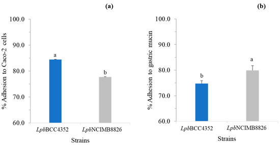 The ability of strains to adhere to intestinal epithelial cells and mucosal surfaces, crucial in conferring health benefits by competing with pathogens to colonize epithelial cells and modulating the host immune system, is considered as a primary criterion in the selection of probiotic microorganisms [78,79,80]. Figure 4a reveals a significantly higher adhesion level of LpbBCC4352 when compared with LpbNCIMB8826 (p < 0.05). LpbBCC4352 cells demonstrated an adhesion rate of 84.5 ± 0.1%, while LpbNCIMB8826 exhibited a lower rate of 77.7 ± 0.1%. However, LpbBCC4352 exhibited lower mucin adherence (74.8 ± 1.1%) than LpbNCIMB8826 (79.9 ± 1.9%), as shown in Figure 4b.