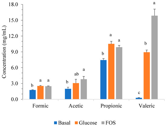 Compared to the basal mSIEM medium, LpbBCC4352 cell viability consistently remained at 5 log CFU/mL throughout the fermentation period (Figure 5a). The quantity of the targeted SCFAs produced was determined to be considerably lower than those observed in the mSIEM medium containing FOS and glucose (Figure 6).