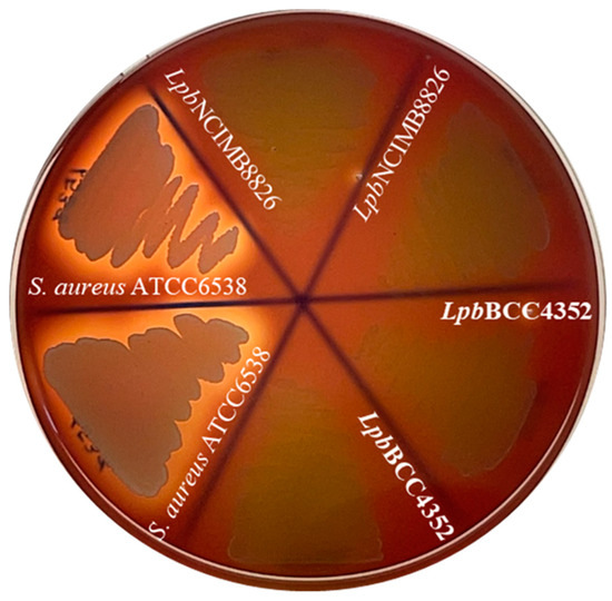 L. plantarum BCC 4352, previously isolated from Nham samples, was obtained from the BIOTEC culture collection (BCC), National Center for Genetic Engineering and Biotechnology (BIOTEC) (Khlong Luang, Thailand). The probiotic L. plantarum NCIMB 8826 (LpbNCIMB8826), employed as the positive control in the experiment, was sourced from The National Collection of Industrial Food and Marine Bacteria (NCIMB) (Scotland, UK). All LAB strains were stored at −80 °C in deMan, Rogosa, and Sharpe (MRS) medium with 15% glycerol (Merck, Germany) and propagated in MRS broth at 30 °C for 18 h before being used for testing of their antimicrobial production.