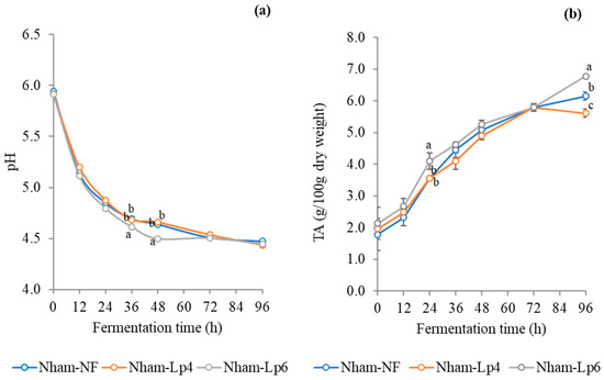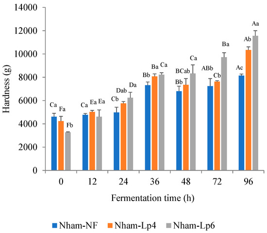 At each sampling point, Nham samples were analyzed for titratable acidity (TA), pH, texture, and color. Titratable acidity (TA) was determined following the AOAC method [54] and expressed as grams of lactic acid per 100 g of Nham (on a dry weight basis). The pH was measured using a standard pH meter (Mettler Toledo, Greifensee, Switzerland). The texture profile analysis (TPA) of Nham was conducted using a TA-XT2i texture analyzer (Stable Micro Systems, Godalming, UK) equipped with a cylindrical aluminum probe (50 mm diameter) as detailed by Visessanguan et al. [20]. Color was evaluated in the CIE L*a*b* color space using a Minolta Colour Meter CR300 (Minolta Camera Ltd., Osaka, Japan). To address color variations, three readings were averaged from the surface of each sample as described by Visessanguan et al. [20]. Total color difference between control sample (Nham-NF) and treatments (Nham-Lp4 and Nham-Lp6) was calculated according to Sharma [55].