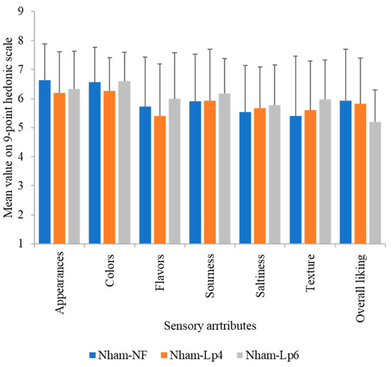 The sensory analysis of Nham was conducted following the procedure outlined in our previous study [21]. Briefly, a group of 30 individuals, regular consumers of Nham, were tasked with assessing the sensory characteristics of Nham. Before the evaluation, Nham samples with a pH of not more than 4.6 were left to reach room temperature for a minimum of 30 min and then randomly distributed to the panelists. Each sensory aspect was assessed on a hedonic scale ranging from 1 to 9, where panelists indicated their score based on their perception, with 1 signifying extreme dislike, 5 indicating neither liking nor disliking, and 9 representing extreme liking.