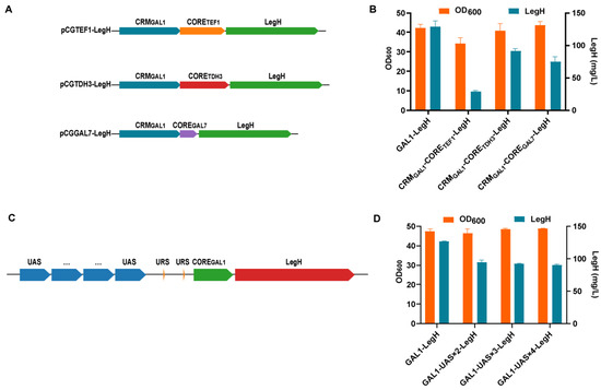 In previous research, the original PGAL1 promoter was used to induce the expression of LegH [13]. However, the expressional level of target proteins can be further enhanced via the modification of the PGAL1 promoter [14,18]. To improve the expression of LegH, the elements of the PGAL1 promoter were modified to enhance its strength (Figure 1A). The CRMGAL1-CORETEF1-LegH, CRMGAL1-CORETDH3-LegH, and CRMGAL1-COREGAL7-LegH strains with different hybrid promoters were constructed by replacing the PGAL1 core promoter with CORETEF1/CORETDH3/COREGAL7 (the core promoter of the PTEF1/PTDH3/PGAL7). However, the titers of LegH were significantly decreased by 77.6% in the CRMGAL1-CORETEF1-LegH strain (29.0 mg/L), 29.0% in the CRMGAL1-CORETDH3-LegH strain (91.8 mg/L), and 41.8% in the CRMGAL1-COREGAL7-LegH strain (75.2 mg/L), respectively (Figure 1B). Thus, the increase in the UAS numbers was alternatively attempted [15,27]. One to three tandem repeats of UASGAL1 were fused to the original PGAL1 promoter with one UASGAL1, and three strains were generated (GAL1-UAS × 2-LegH strain, GAL1-UAS × 3-LegH strain, and GAL1-UAS × 4-LegH strain) (Figure 1C). Unfortunately, the results were also not positive (Figure 1D). Thus, the original PGAL1 promoter was employed to control the expression of LegH.