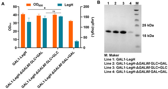 The expression of LegH in GAL80 knockout strains: (A) the titer of LegH under different addition of carbon sources; (B) the results of SDS-PAGE. “*” p < 0.05 vs. compared group; “ns” stands for “not significant”.