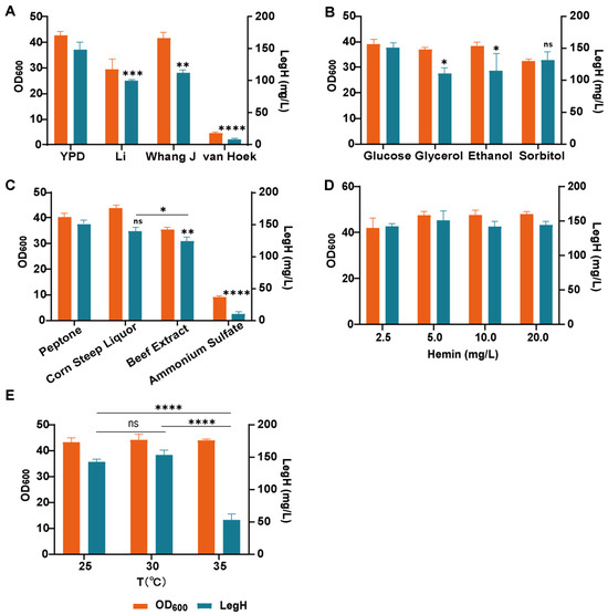 The optimization of LegH expression at the shaking-flask level: (A) the effects of different media on LegH expression; (B) the effects of different carbon sources on LegH expression; (C) the effects of different nitrogen sources on LegH expression; (D) the effects of different hemin concentrations on LegH expression; (E) LegH was expressed at different temperatures. “*” p < 0.05 vs. compared group, “**” p < 0.01 vs. compared group, “***” p < 0.001 vs. compared group, and “****” p < 0.0001 vs. compared group; “ns” stands for “not significant”.