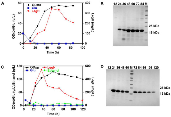 The efficient synthesis of LegH in a 5-L fermenter: (A) the LegH obtained via batch fermentation; (B) the results of SDS-PAGE for batch fermentation; (C) the LegH obtained via fed-batch fermentation through two-stage fermentation; (D) the results of SDS-PAGE for fed-batch fermentation.