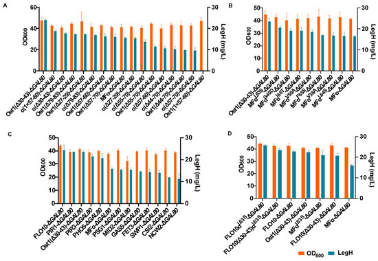 In strategy (i), the Ost1(Δ30-43)-ΔGAL80 strain (24.0 mg/L) had the highest secreted titer of LegH of all the constructed strains, which was 1.53-fold higher than the secreted titer obtained for the MFα-ΔGAL80 strain (Figure 5A). In strategy (ii), the secretion titer of LegH was 1.25-fold higher in the MFαL63S-ΔGAL80 strain (20.7 mg/L) than the titer in the MFα-ΔGAL80 strain (Figure 5B). Of the 11 hybrid signal peptides constructed via strategy (iii), the highest secreted titer of LegH was obtained for the FLO10-ΔGAL80 strain (24.4 mg/L), which was 1.54-fold higher than the titer for the MFα-ΔGAL80 strain (Figure 5C). In addition, the FLO10(Δ30-43)-ΔGAL80 strain (deletion of 44 to 70 residues in the pro-peptide of α-factor signal peptide) was constructed because the pro-α(Δ30-43) showed better secretory effect fused with both pre-Ost1 and pre-α. And the FLO10αL63S-ΔGAL80 strain was constructed by the FLO10-ΔGAL80 strain with the L63S single mutation in the pro-α. Finally, the FLO10(Δ30-43)αL63S-ΔGAL80 strain was constructed based on the FLO10(Δ30-43)-ΔGAL80 strain with the L63S single mutation in the pro-α.