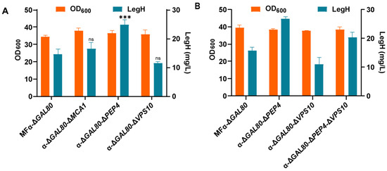 Knockout of genes related to the degradation of heterologous proteins: (A) the effect of protease knockout on LegH secretion; (B) the effects of PEP4 and VPS10 knockout on LegH secretion. “***” p < 0.001 vs. compared group; “ns” stands for “not significant”.