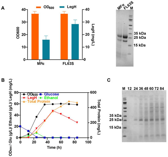 The secreted LegH obtained in FL63S strain via batch fermentation at the 5-L fermenter level: (A) the LegH secreted by the FL63S and original MF-α strains at the shaking-flask level; (B) the results of batch fermentation at the 5-L fermenter level; (C) the results of SDS-PAGE for batch fermentations.