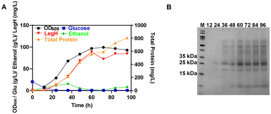 The LegH obtained in FL63S strain via fed-batch fermentation at the 5-L fermenter level: (A) the results of fed-batch fermentation at the 5-L fermenter level; (B) the results of SDS-PAGE for fed-batch fermentations.