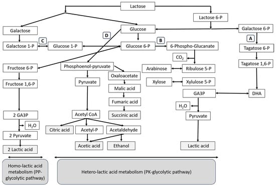 Pathways of lactic acid production. A route: D-tagatose 6-phosphate pathway. B route: pentose phosphoketolase (PK) pathway for hetero-lactic acid metabolism. C route: Embden–Meyerhof–Parnas (EMP) pathway for homo-lactic acid metabolism. D route: glycolysis pathway [12].